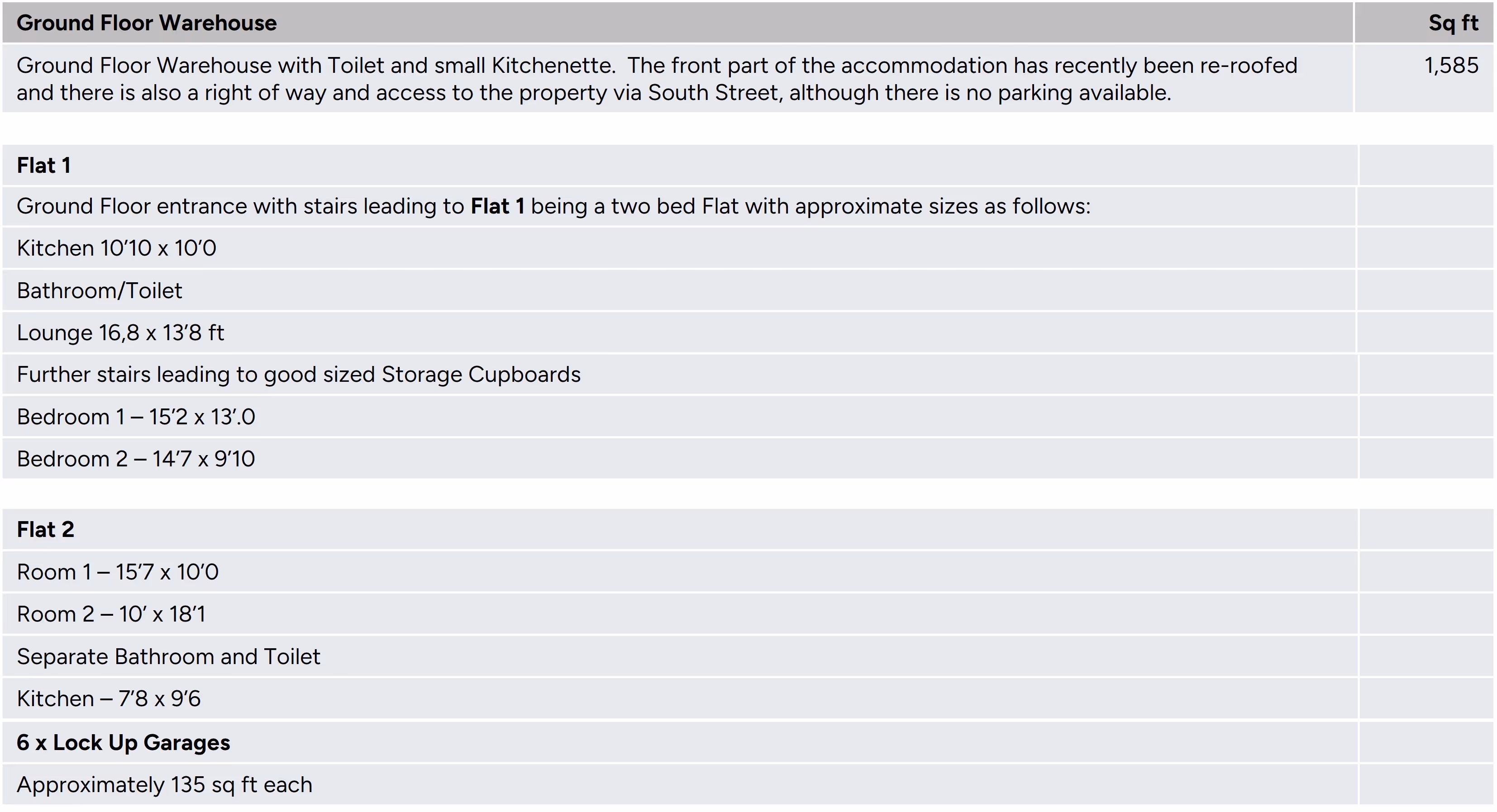 The premises itself comprise of a Warehouse, 1 x 2 Bed Flat, 1 x 1 Bed Flat and 6 Lock Up Garages. The Accommodation sizes are as follows:
