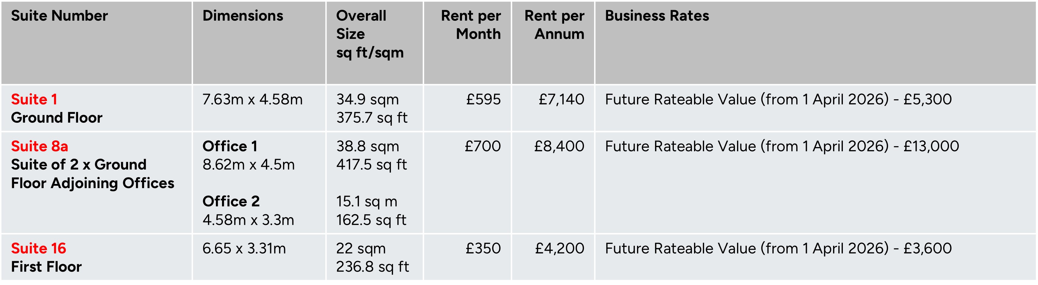 Rateable Value: See table on next page for individual Suites